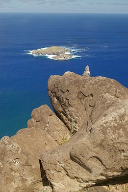Gezicht vanaf Orongo op Moto Nui met Vogelman-petrogliefen op de voorgrond